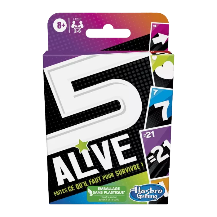 5 Alive est une version délirante du 21 dans laquelle les joueurs ont des cartes numérotées, avec chacune une valeur de base, et tentent de ne pas dépasser 21 points pour rester en vie. Ils devront faire ce qu’il faut pour survivre ! Ils devront prendre des risques, établir une stratégie et saboter les plans de leurs adversaires pour les forcer à perdre des vies ! Si un joueur dépasse 21, il doit retourner une carte Vie. Si un joueur retourne ses 5 cartes, il est éliminé. Le processus d’élimination se poursuit ainsi jusqu’à ce qu’il ne reste qu’un seul joueur en vie, le gagnant ! Les joueurs suivent les instructions des cartes Joker pour battre un adversaire, ou pour rester en vie. On peut varier le jeu avec les versions La fin en mort subite, pour une partie en accéléré, ou le jeu en équipe. Le jeu s’apprend facilement et les parties sont rapides.