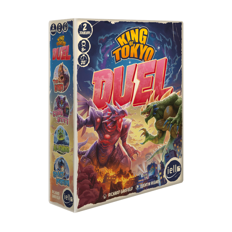 King of Tokyo Duel est un jeu de dés pour deux joueurs dans la lignée King of Tokyo . Choisissez votre monstre au pouvoir unique et lancez de nouveaux dés pour attirer les jetons de renommée et de destruction vers vous… ou écrasez votre rival avec de nouvelles cartes de pouvoir spéciales pour devenir le roi ultime de Tokyo !