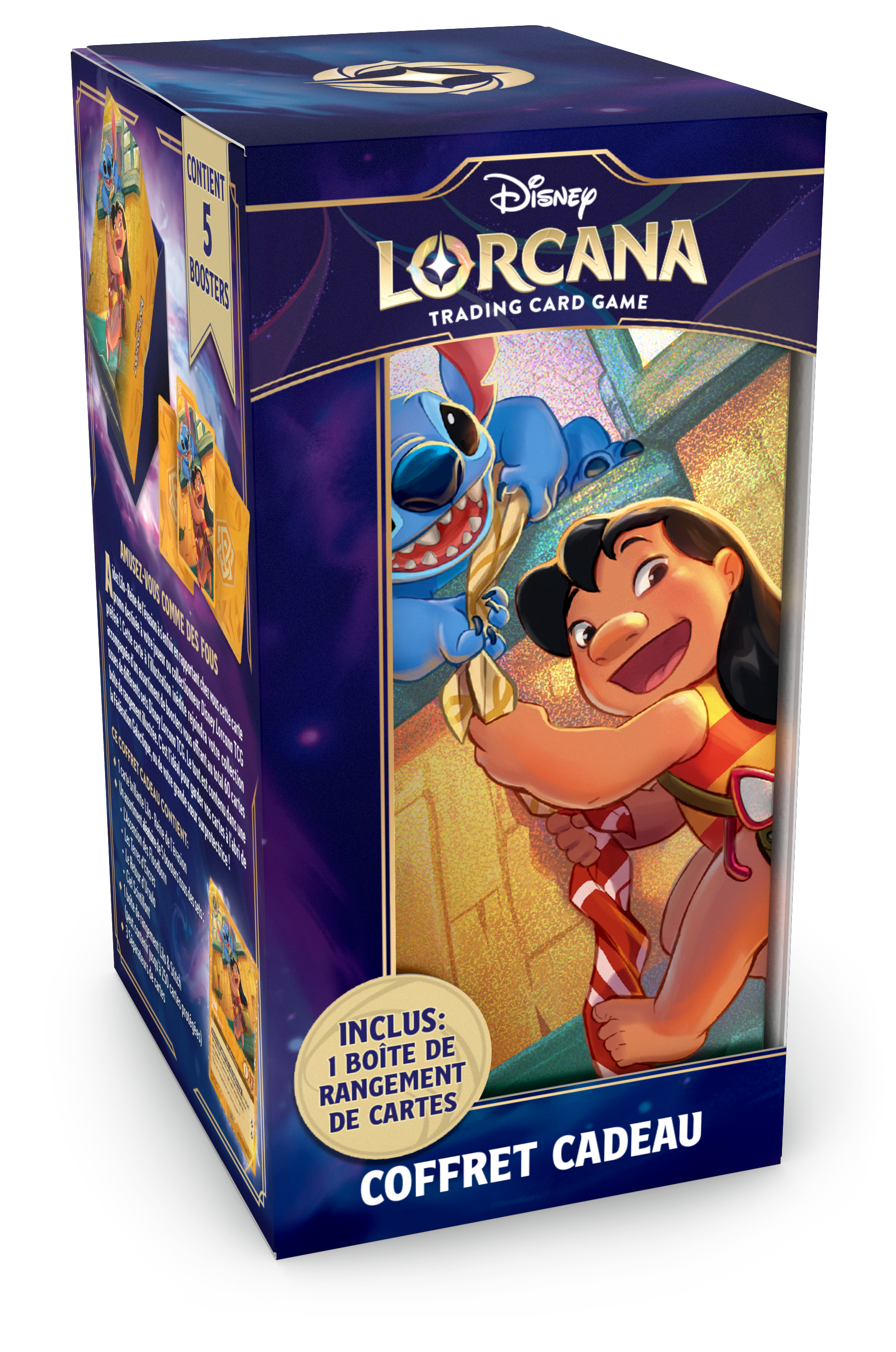 Lorcana – Coffret Cadeau Lilo comprend 5 boosters aléatoires des sets 2 à 5, une nouvelle carte promotionnelle Lilo – Escape Artist avec une illustration alternative de Grace Tran, une boîte de rangement reprenant le même dessin et 3 séparateurs de cartes.
