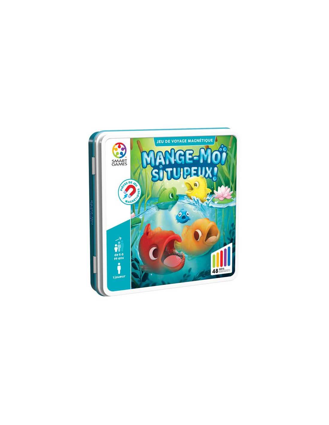 Mange-Moi Si Tu Peux! est un jeu de voyage magnétique comprenant 48 défis à résoudre de 4 niveaux de difficultés différentes.