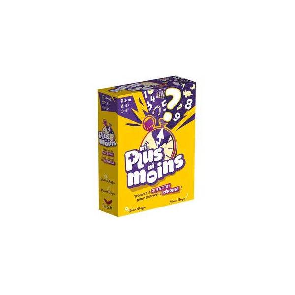 Ni Plus Ni Moins est un jeu d’ambiance où il faut d’abord chercher la question pour trouver la réponse ! Des questions loufoques, de logique, de culture populaire ou des jeux de mots pour faire chauffer vos méninges en équipe.